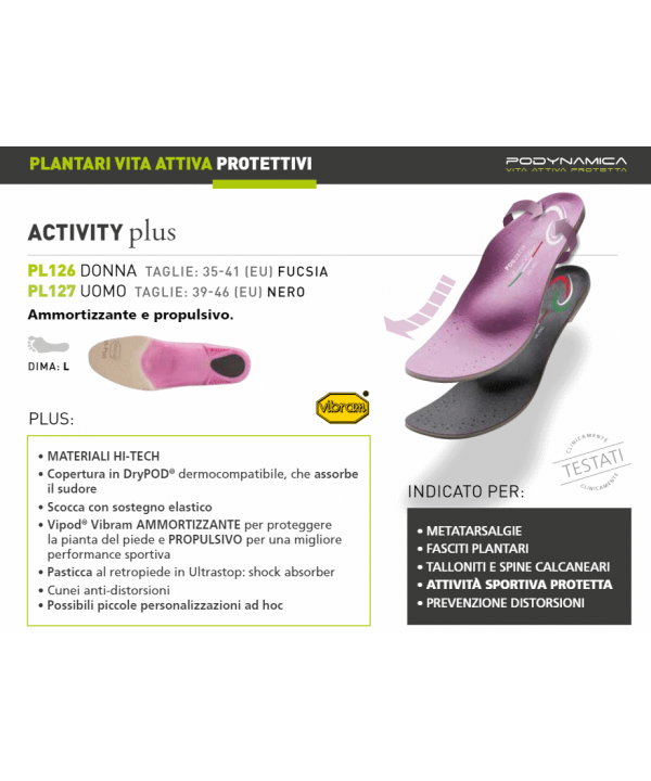 I plantari Activity plus sono pensati per l'attività fisica protetta, ed indicati in casi di metatarsalgie, fasciti plantari, talloniti e spine calcaneari. Sono utili anche nella prevenzione delle distorsioni.